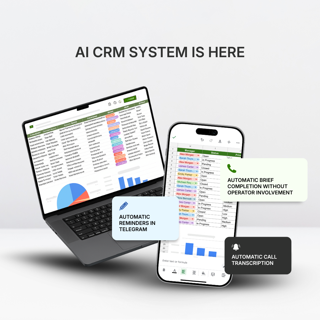 AI-CRM is designed to operate in the most familiar and convenient way. Everything is built on a standard Google Sheet, where transcriptions and briefings from managers’ conversations are automatically collected. From any phone dialogue, the system generates a summary with the most important details and reminds you of the next call, adding useful sales tips. This ensures you never lose a single client.