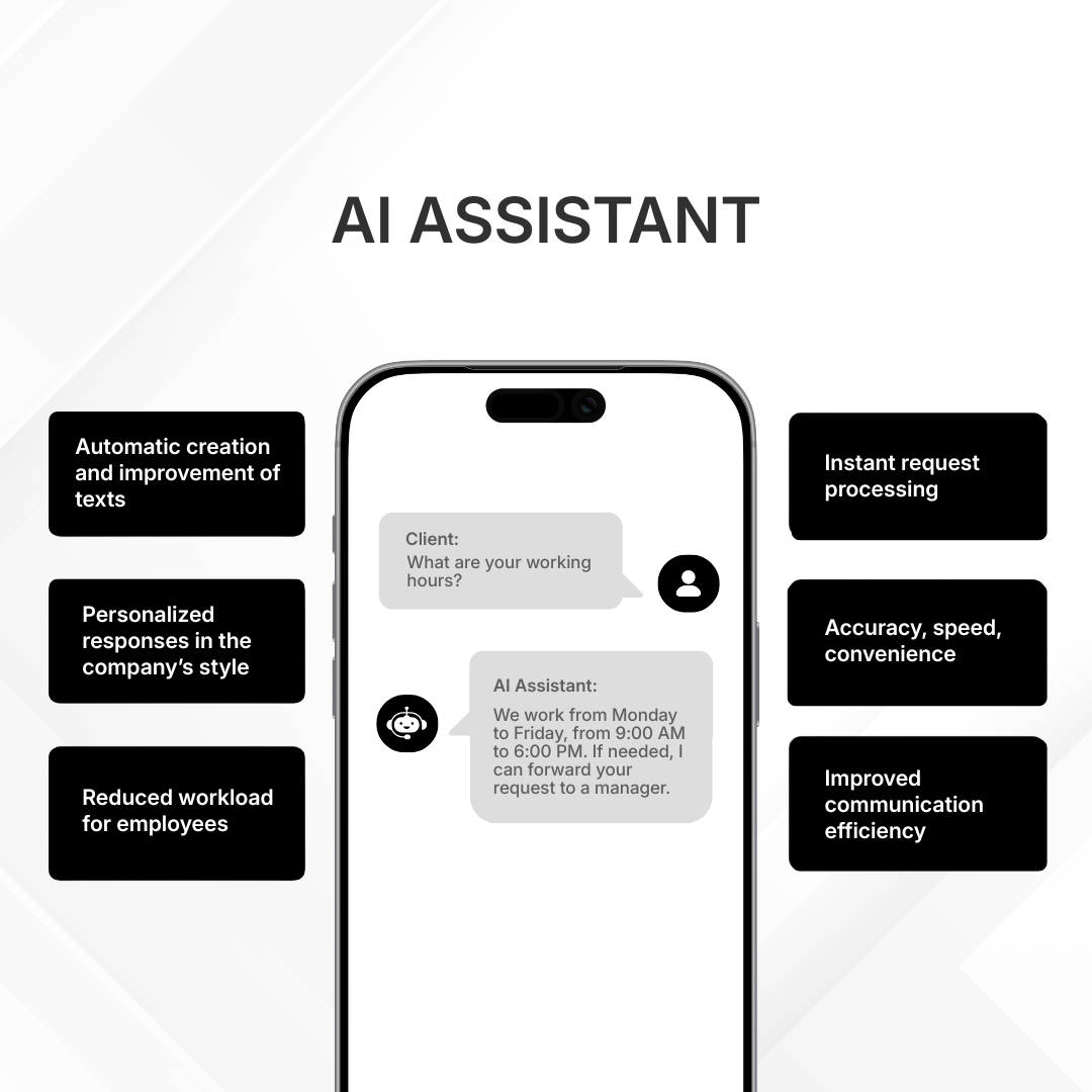 AI Assistant is a modern digital tool that makes client interactions comfortable from the very first contact. It greets visitors, answers frequently asked questions, assists with navigating the company, and directs inquiries to the appropriate specialists.