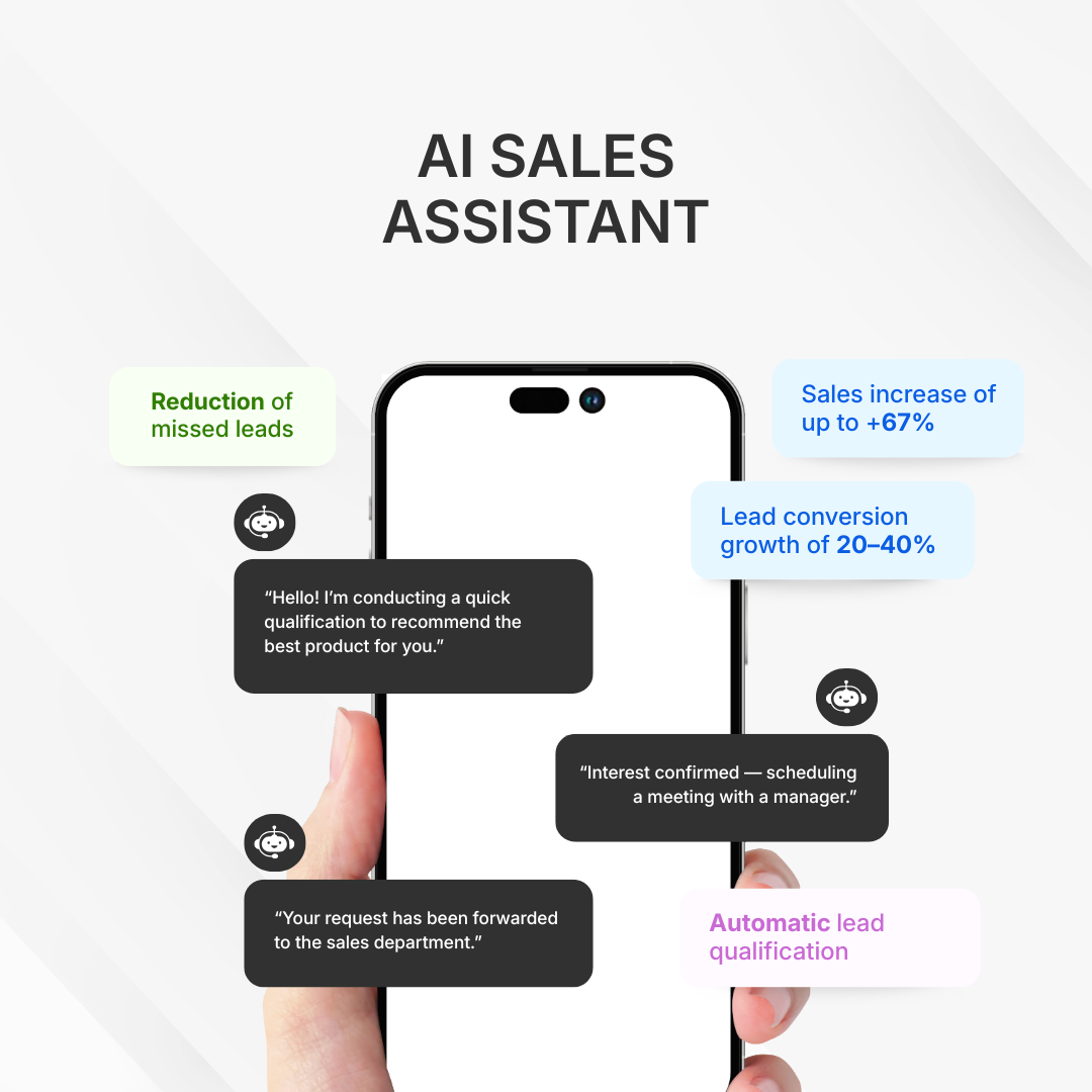 AI Sales Assistant takes on routine communications and initial qualification, allowing your team to focus on strategically important tasks — closing deals and working with key clients. It handles multiple requests simultaneously, responds instantly to interest, and prepares managers for productive meetings.