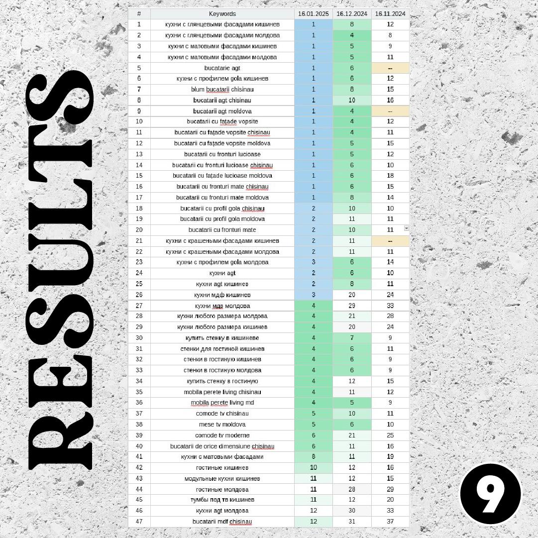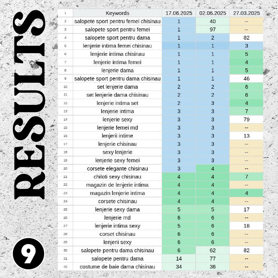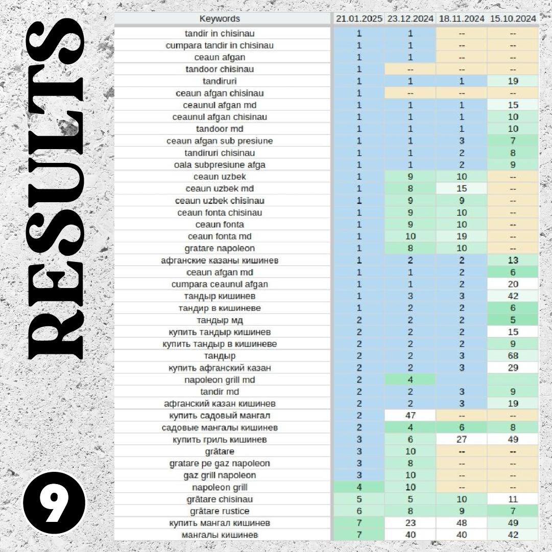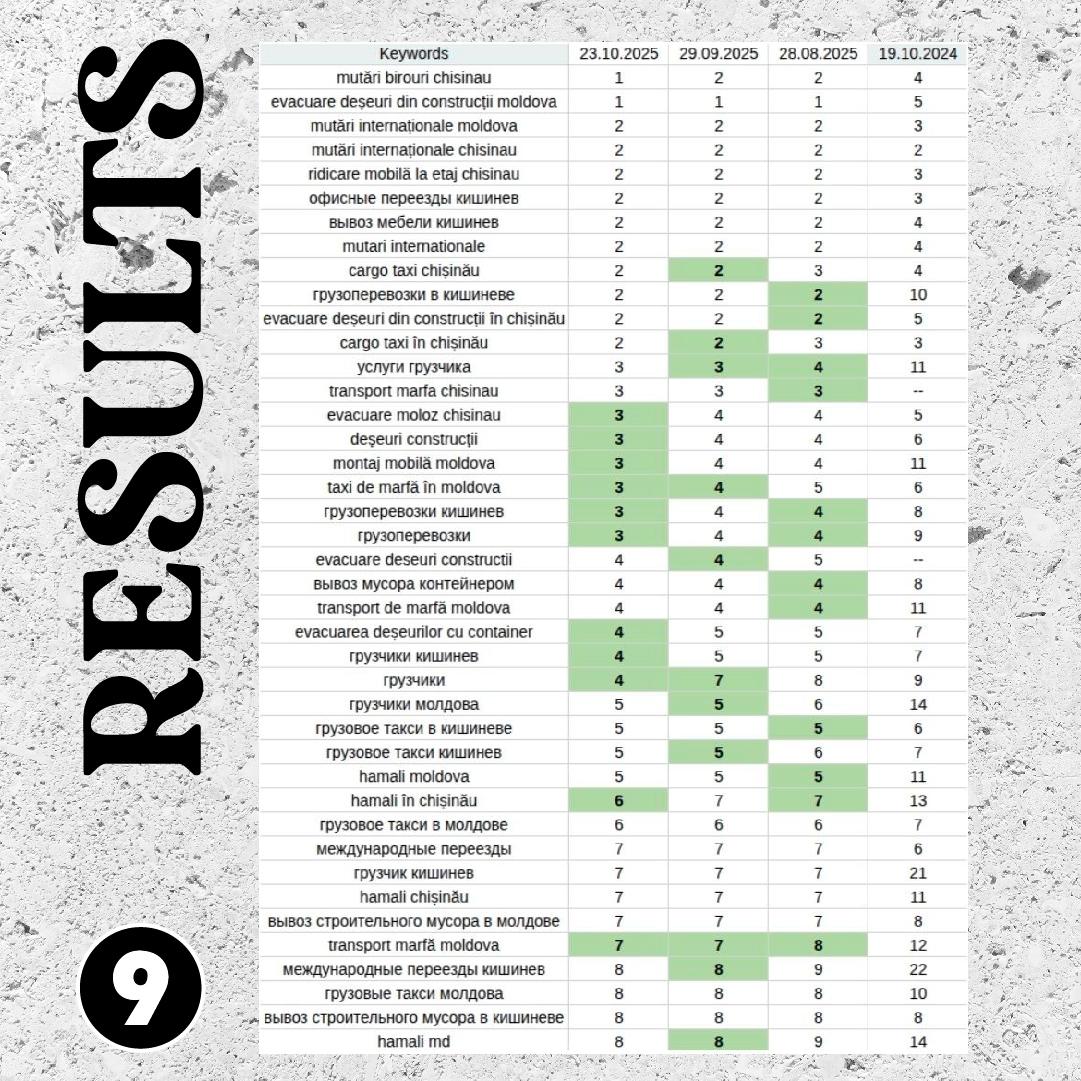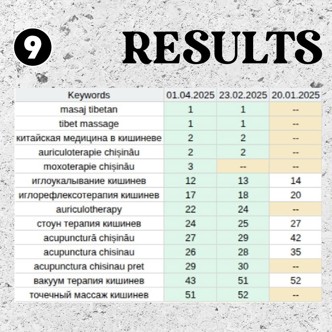 După trei luni, rezultatele au vorbit de la sine. Peste 40 de cuvinte-cheie au ajuns în TOP-10 Google. Compania a început să fie vizibilă organic, fără publicitate.
